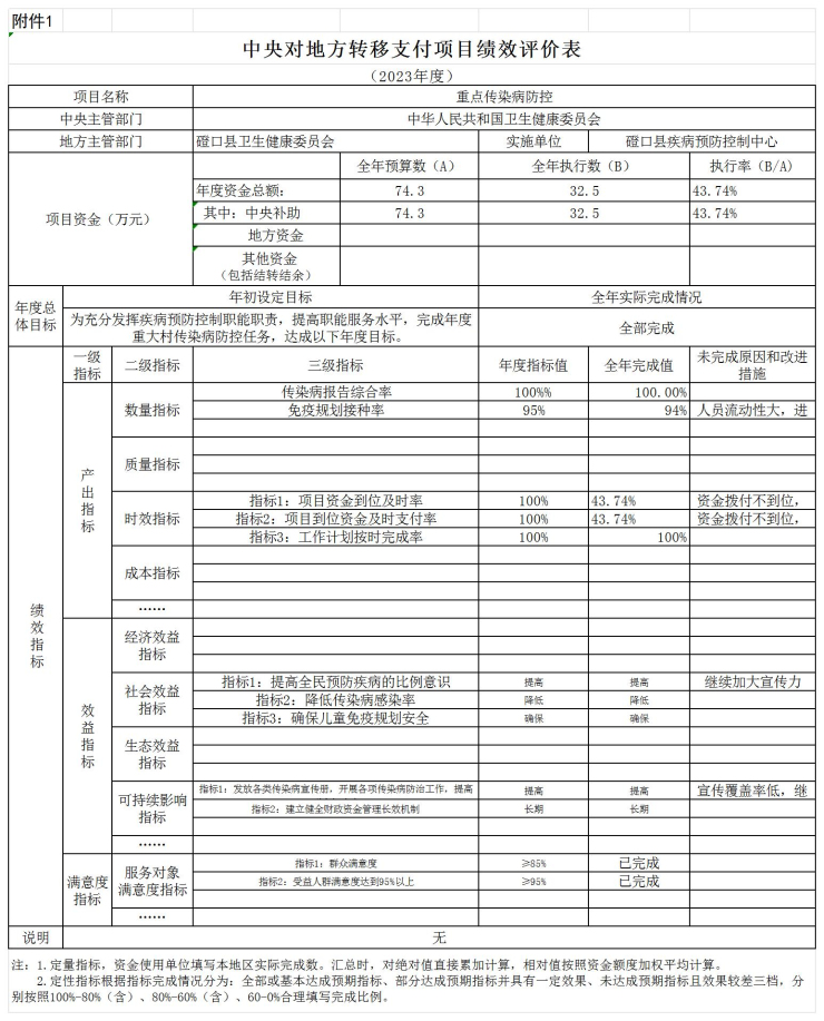 1.数量指标完成情况:传染病综合报告率达100%,免疫规划接种率93.53%.