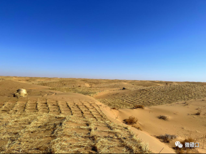 在乌兰布和沙漠防沙治沙综合示范区,记者看到,工人们将撒在沙上的柴草压入沙中做成草方格沙障。放眼望去,连绵起伏的沙丘上,纵横交错的草方格沙障犹如排列整齐的“魔方”覆盖在沙丘上。
