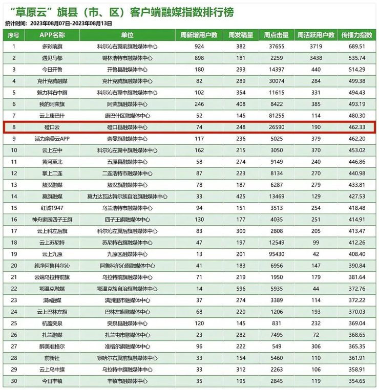 在8月7日—8月13日,内蒙古旗县(市、区)融媒体客户端影响力排行榜中,“磴口云”,排名内蒙古旗县(市、区)融媒体客户端影响力排行榜第8名。