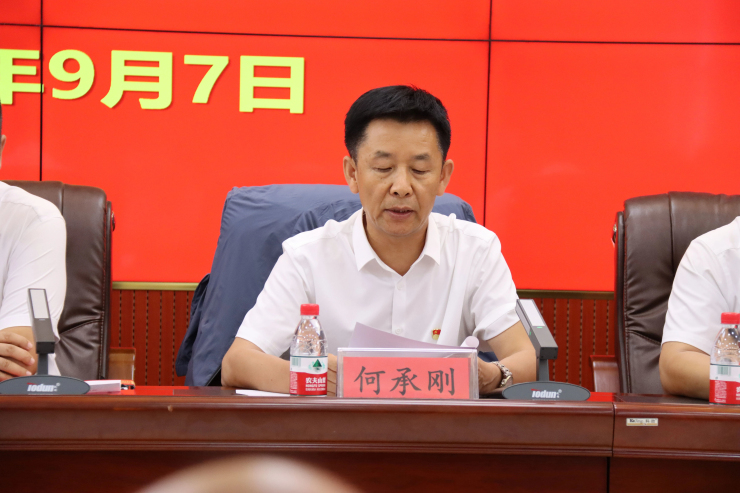 何承刚副主任宣读《关于表彰全县教育工作先进集体、优秀教育工作者、优秀德育工作者、师德师风先进个人、优秀教师和优秀班主任的决定》