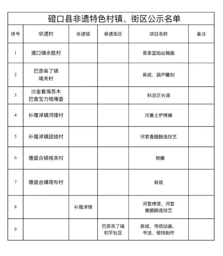 为深入贯彻落实习近平文化思想及习近平总书记关于非遗保护的重要指示批示精神,聚焦打造“北疆文化”品牌,加强非遗区域性整体保护,推进非遗特色村镇、街区持续健康发展,确保非遗特色村镇、街区形成一定规模和效应,按照巴文旅广办发〔2024〕1号《关于组织开展盟市级、旗县区级非遗特色村镇、街区申报评定工作的通知》要求,经各苏木镇申报筛选、评委会审核评议等 程序, 现就确定的县级非遗村镇、街区(名单附后)予以公布,公示期为7天。时间:2024年3月13日至2024年3月19日。