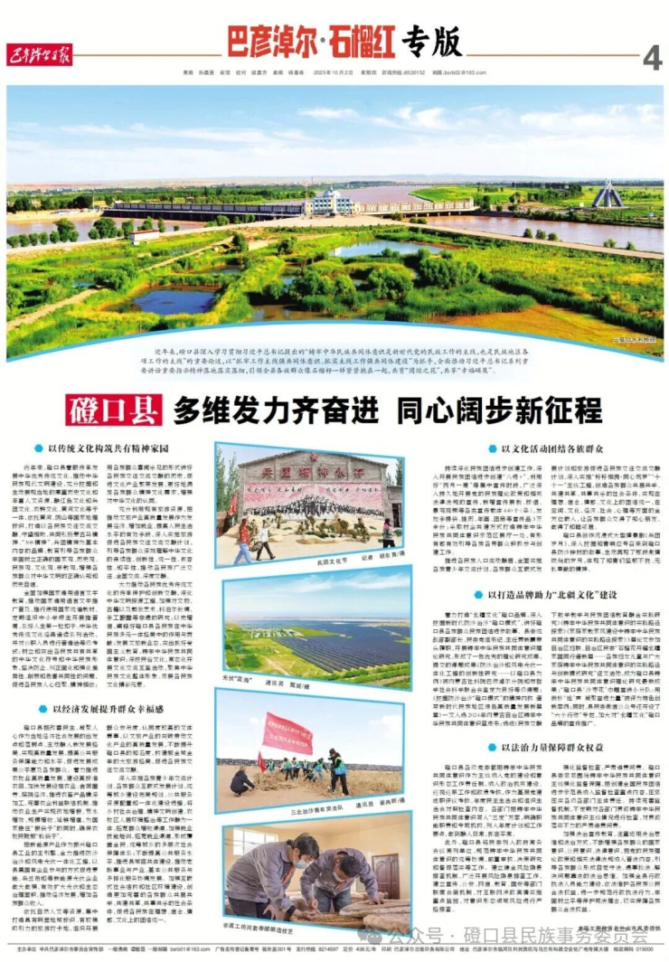 近年来,磴口县深入学习贯彻习近平总书记提出的“铸牢中华民族共同体意识是新时代党的民族工作的主线,也是民族地区各项工作的主线”的重要论述,以“抓牢工作主线强共同体意识、抓实主线工作强共同体建设”为抓手,全面推动习近平总书记系列重要讲话重要指示精神落地落实落细,引领全县各族群众像石榴籽一样紧紧抱在一起,共育“团结之花”,共享“幸福硕果”。