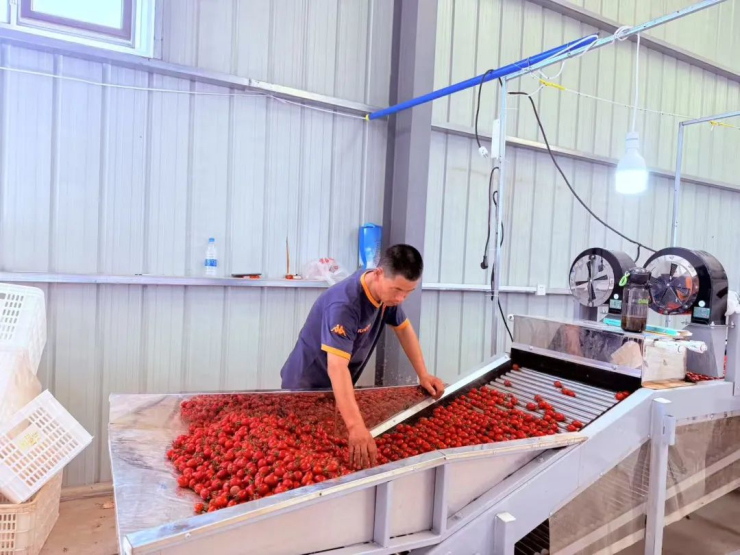 “我们种植的番茄果苗区别于大田番茄和市面上的其他品种“小番茄”,可结12层果实,每七天就能迎来一茬丰收,”大棚负责人王欣荣笑容满面地说,“从七月到十一月,亩产预计可达7000至9000斤。我们还承包了坝楞村的2个仓储车间,进行严格的筛选与包装,确保每一颗送达‘北上杭’等大都市的果实都饱满多汁,品质上乘,按照当下市场价格计算,亩均毛利润在48000元左右,纯利可达26000元,收益相当可观。”