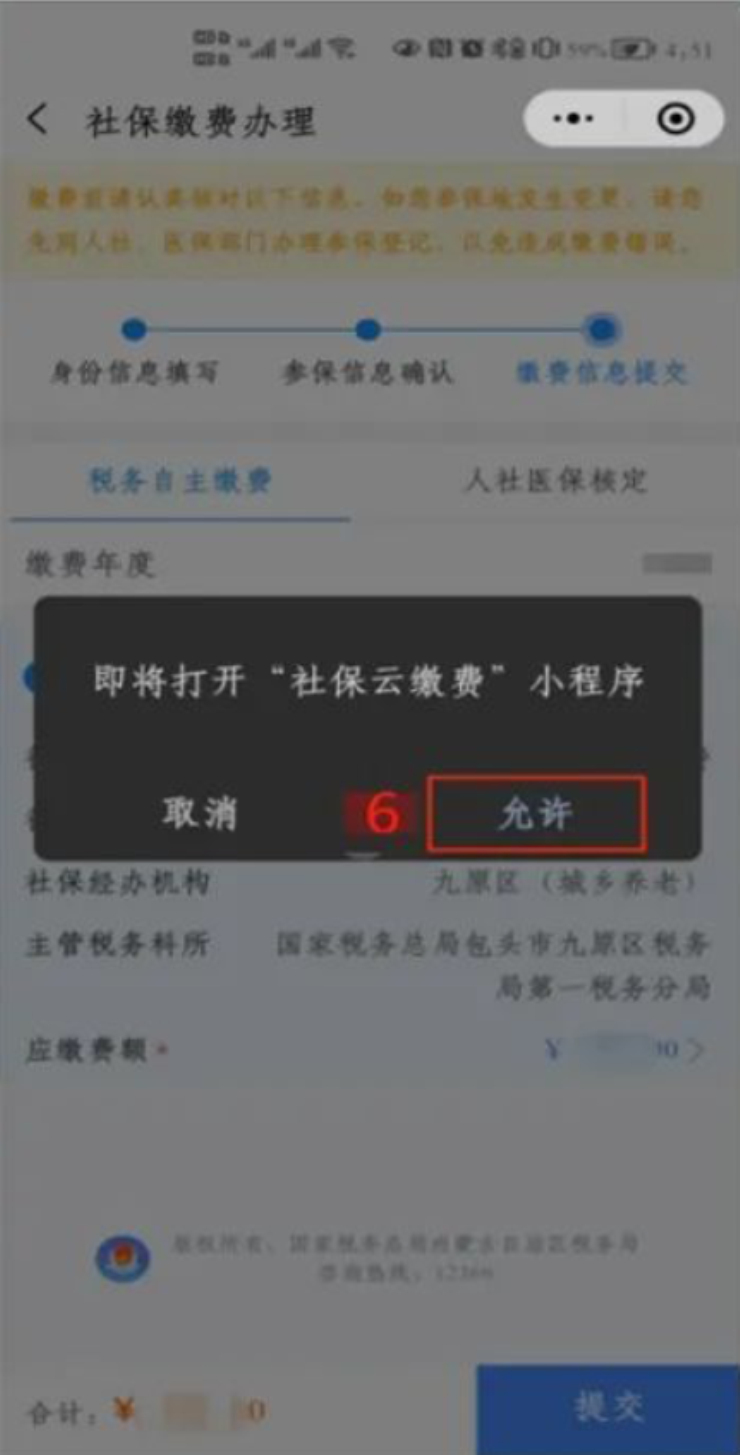 6.页面提示即将打开“社保云缴费”小程序,点击允许;