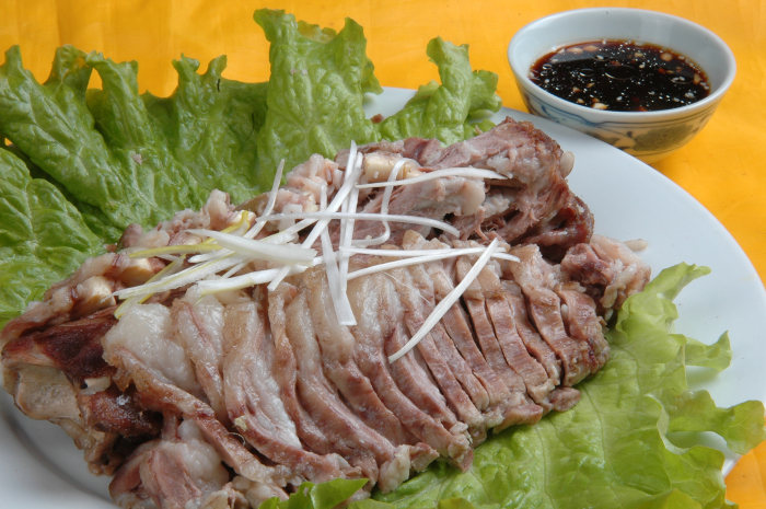 清蒸羊肉:原料为羊肉,经煮、切、加调料蒸后,将原汤调好味浇在清蒸羊肉条上,撒上香菜即成。同红烧扒肉条一样,切成条的羊肉是放入碗内蒸的。其特点是肉质鲜嫩、软烂而清香,汤汁清亮。