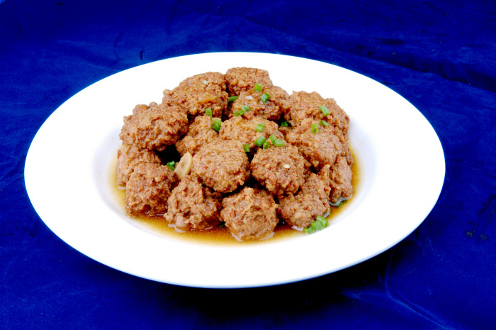 红烧丸子:肉馅加调料粉、鸡蛋、温淀粉、高汤拌匀,将拌好的肉馅用手挤成小丸子下油锅炸,见丸子炸熟呈金黄色捞出,放入碗内,加调料,再上笼蒸熟烂取出。最后,将原汤控勺内,烧开后用湿淀粉勾芡,浇丸子上面即成。该菜特点:嫩、酥、软、烂、可口。