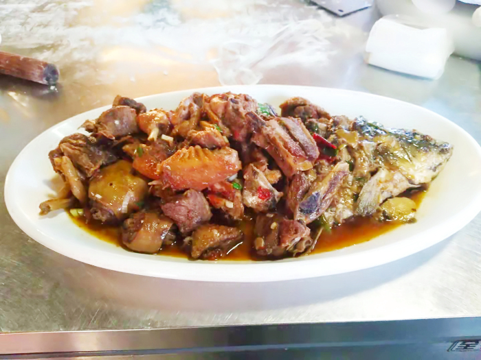 鸡勾鱼是磴口当地人独创的一种吃法。农村的场面鸡和黄河野生鱼,一种是水里游的,一种是岸上跑的,看似毫不相干的两种食材,碰撞在一起,再加上独特的调料和做法,上面铺一层起了面的锅贴饼,用柴火灶的大铁锅炖煮,能烹调出别样的美味。出锅后的鸡和鱼特别鲜美,尤其是混合了两种食材味道的锅贴饼,既有鱼肉的鲜味又有鸡肉的香味,色香味俱全。