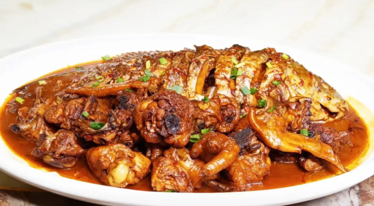 散养的红公鸡海子里吃芦苇长大的有机大草鱼满锅的红黄油亮鸡肉的醇香和草鱼的鲜美
