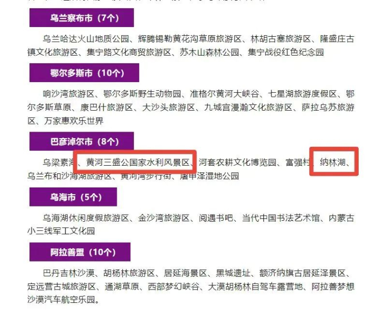 根据盟市划分,推荐的100个网红打卡地名单,巴彦淖尔市共有8个地方入选,其中磴口县黄河三盛公国家水利风景区和纳林湖成功入选网红打卡地: