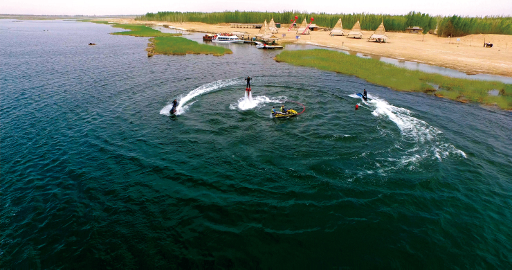 水、鱼、苇、鸟、沙,共同勾勒出纳林湖这幅秀美的画卷。徐徐清风,波光粼粼,鲤鱼戏水,苇荡迷津,鸥鸟惊飞,沙雕群落……一幕幕都令人心驰神往,流连忘返。黄金海岸上有众多娱乐项目可供游人玩乐,湖滨浴场、水上飞伞、飞鱼、水上竹排、自驾游艇、摩托艇、越野车基地、拓展射击场、自助烧烤等等,游人可以在这里尽情地释放。水陆三十六玩等娱乐项目,让您坐拥万顷碧波,尽享大自然之惬意。