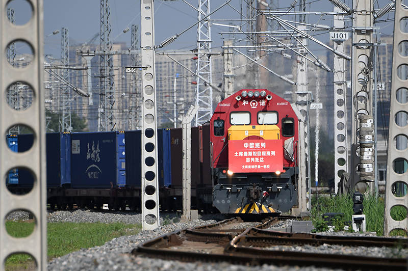 满载土库曼斯坦甘草中药材原料的中欧班列回程列车抵达西安国际港站(2022年8月31日摄)。新华社记者 李一博 摄
