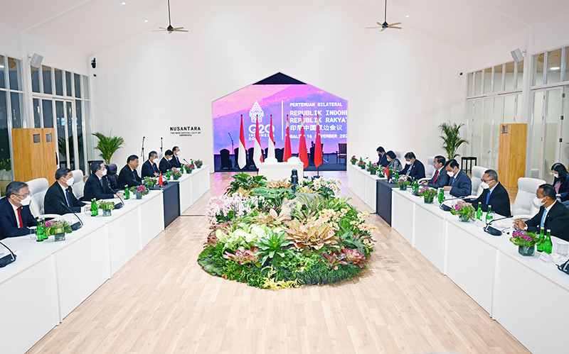 当地时间11月16日晚,国家主席习近平在巴厘岛同印度尼西亚总统佐科举行会谈。新华社记者 饶爱民 摄