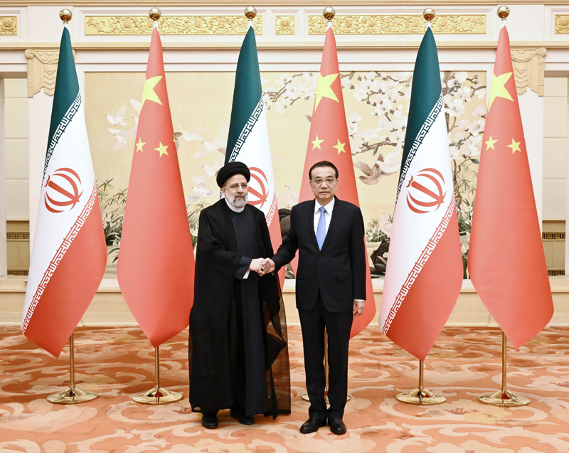 2月14日,国务院总理李克强在北京人民大会堂会见来华进行国事访问的伊朗总统莱希。新华社记者 燕雁 摄