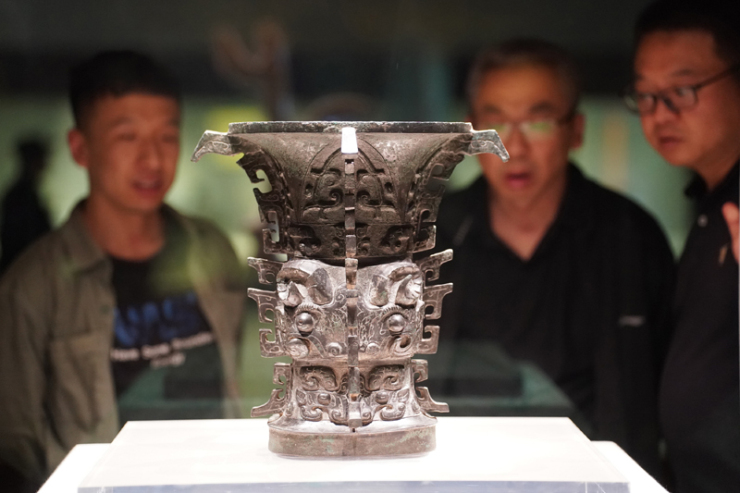 2024年5月9日,游客在陕西宝鸡青铜器博物院内参观西周文物何尊。新华社记者 邵瑞 摄