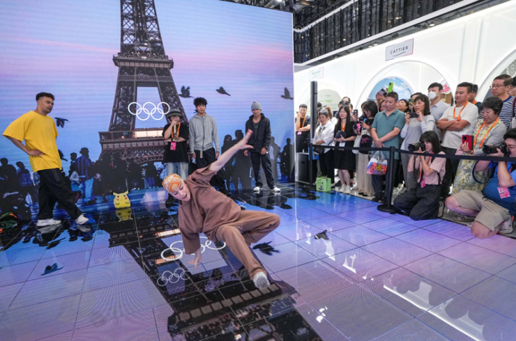 2024年9月14日,在2024年服贸会同国家会议中心综合展区的主宾国法国展台,中法两国街舞好手在表演霹雳舞。新华社记者 陈晔华 摄