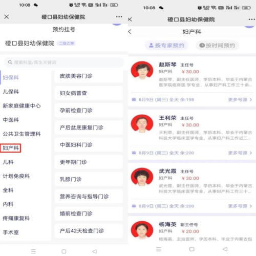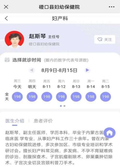 第三步:选择就医科室(例:妇产科),选择就医大夫。