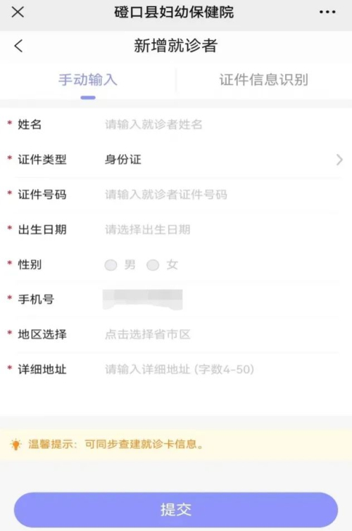 第四步:注册个人信息(已注册的患者可略过此项),填写手机号,获取验证码,登录,完善就诊患者实名信息。