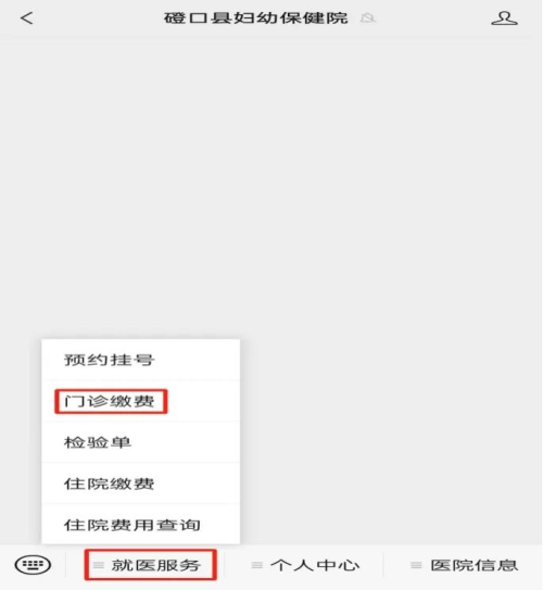 第一步:公众号左下角点击“就医服务”—“门诊缴费”。