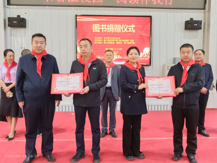 活动中,孟乐向陈建来授予“磴口县图书馆 磴口县第二完全小学分部”牌匾。孟乐和陈建来为图书捐赠方县图书馆、新联会、知联会颁发“尊师重教”荣誉证书,感谢他们对磴口县教育事业和学生读书工程的关注和支持。