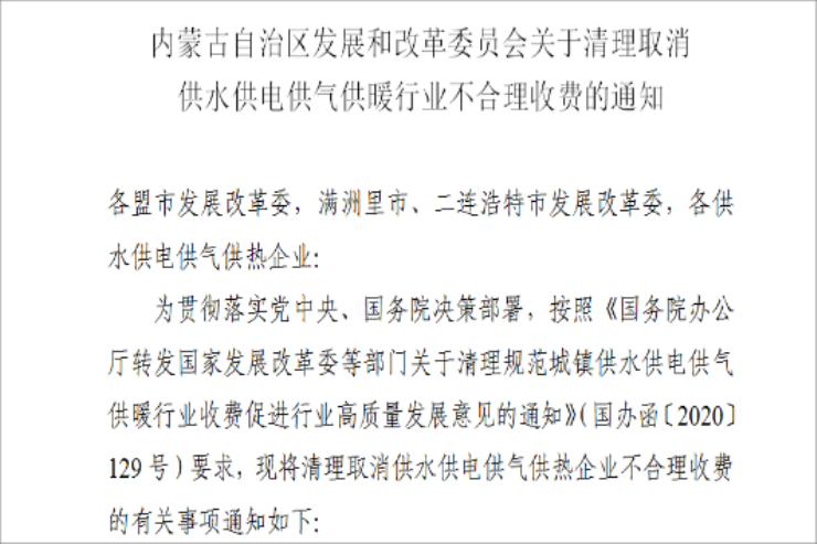 为贯彻落实党中央、国务院决策部署,按照《国务院办公厅转发国家发展改革委等部门关于清理规范城镇供水供电供气供暖行业收费促进行业高质量发展意见的通知》(国办函〔2020〕129号)要求,近日,内蒙古发展改革委印发《关于清理取消供水供电供气供暖行业不合理收费的通知》(内发改价费字〔2021〕172号,以下简称《通知》)。