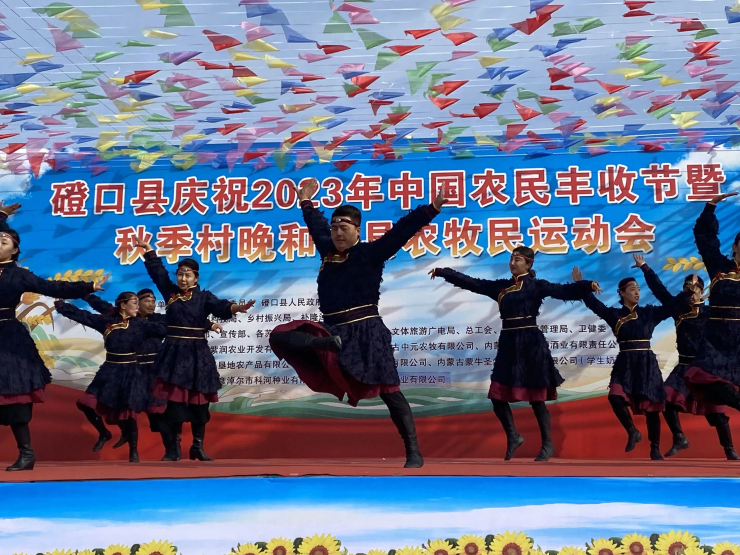 精彩的文艺演出为农牧民群众献上了一台喜庆丰收共享和美的艺术盛宴。开场舞《马蹄随想》拉开帷幕。歌曲《我在纳林湖等着你》、相声《你好 二十大》腰鼓队《舞动中国》、健身球表演《红颜》、广场舞《饮酒欢歌》等形式多样的节目轮番上演,赢得现场观众阵阵掌声。