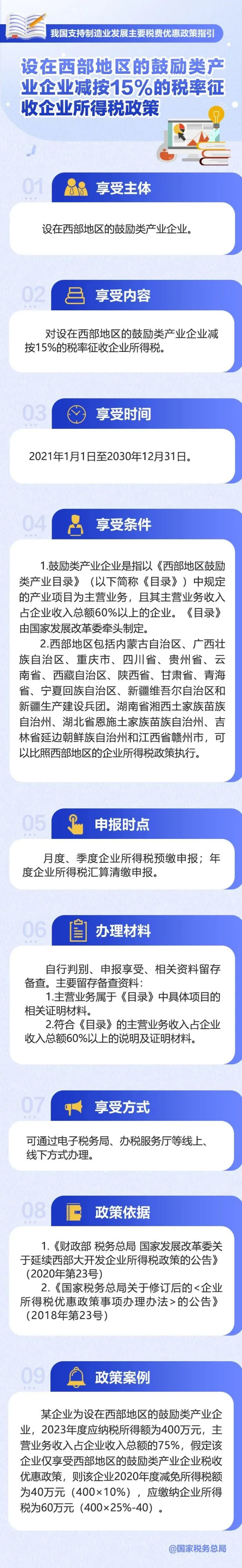 制造业是立国之本、强国之基,是实体经济的重要组成部分。中央经济工作会议指出,“落实好结构性减税降费政策,重点支持科技创新和制造业发展”。为使大家更加全面熟悉了解政策、更加高效准确适用政策,财政部、国家税务总局近日发布《我国支持制造业发展主要税费优惠政策指引》。今天带你了解:设在西部地区的鼓励类产业企业减按15%的税率征收企业所得税政策↓