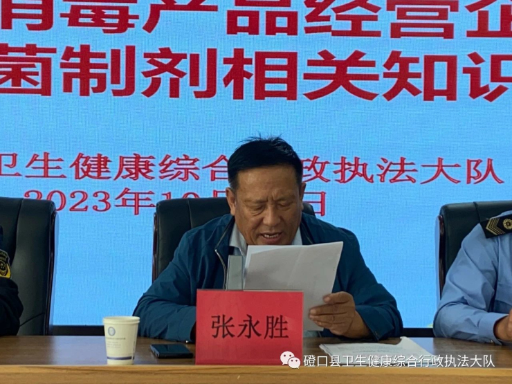 县卫健委副主任张永胜传达了国家疾控局、中央网信办、最高人民检察院等7部门和内蒙古自治区卫生健康委、自治区党委网信办、自治区人民检察院等7部门以及巴彦淖尔市卫生健康委、市委网信办、市人民检察院等5部门下发的《关于开展抗(抑)菌制剂突出问题专项整治工作通知》精神。