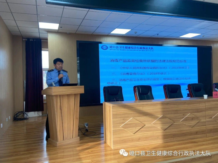 最后,磴口县卫生健康综合行政执法大队副大队长何玉前讲解消毒产品相关知识,依据《中华人民共和国传染病防治法》《消毒管理办法》《消毒产品标签说明书通用要求》《消毒产品卫生安全评价技术要求》等新标准和规范对(抗)抑菌制剂的概念、分类、经营单位索证、消毒产品标识标签说明、产品安全评价报告中容易忽略的细节进行重点讲解。