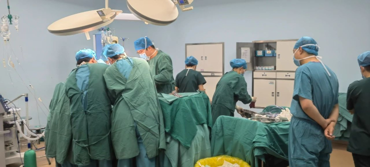 9点26分,男性患者进入急诊救治绿色通道,各相关专业专家立即投入到患者的抢救工作中。患者伤势非常严重,已出现失血性休克,血压、心率等各项生命指征都严重低于正常值,生命处于极度危险之中。医护人员立即对其进行抢救,给患者开通一条中心静脉通路,两条外周静脉通路,留置导尿,心电监护,抽血及血气分析等。短短的四分钟后,医护人员完成了各项急救措施,争分夺秒抢救患者生命。紧急CT、B超、化验检查后转入ICU,经救治团队会诊,“一分钟也不能多耽误,患者随时都会有生命危险,必须进行手术治疗”,医院迅速与巴彦淖尔市城市医疗集团牵头单位巴彦淖尔市医院取得联系,紧急派肝胆外科专家到院实施剖腹探查手术,此时患者家属刚到医院,与家属沟通后,经绿色通道将患者直接送到手术室,立即开展手术救治。通过医院自体输血技术的应用,充足的备血,及时的调血,共输注血液5800ml、血浆2350ml,保证了手术的顺利进行,截至下午5点30分,手术顺利,患者转入重症医学科接受后续治疗。