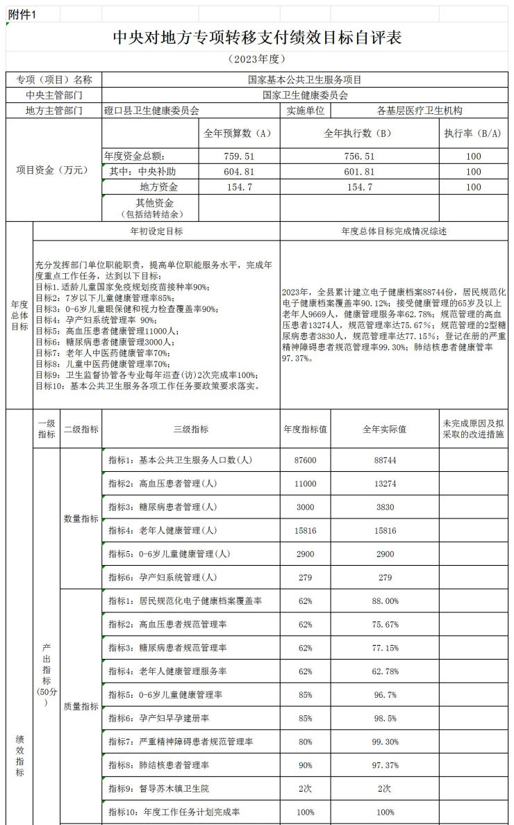 3.成本本指标完成情况:基本公共卫生服务转移支付总额756.51万元,详情见自评表。