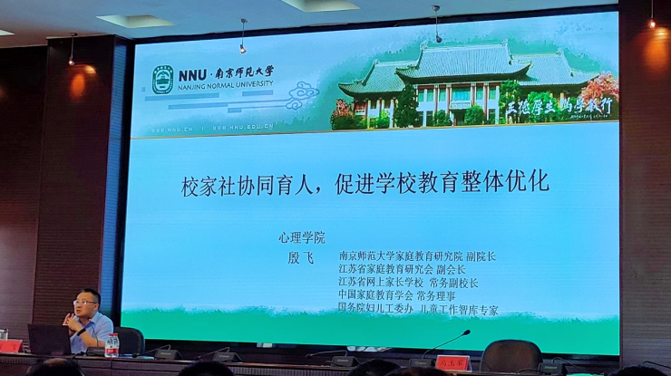 南京师范大学殷飞教授作了题为《家校社协同育人 促进学校整体优化》的专题讲座。他对“双减”背景下的教育现状进行了分析,阐述了家校合作的意义、作用并提出了可行的策略,呼吁家校双向理解,共同做孩子成长的引路人、筑梦人。
